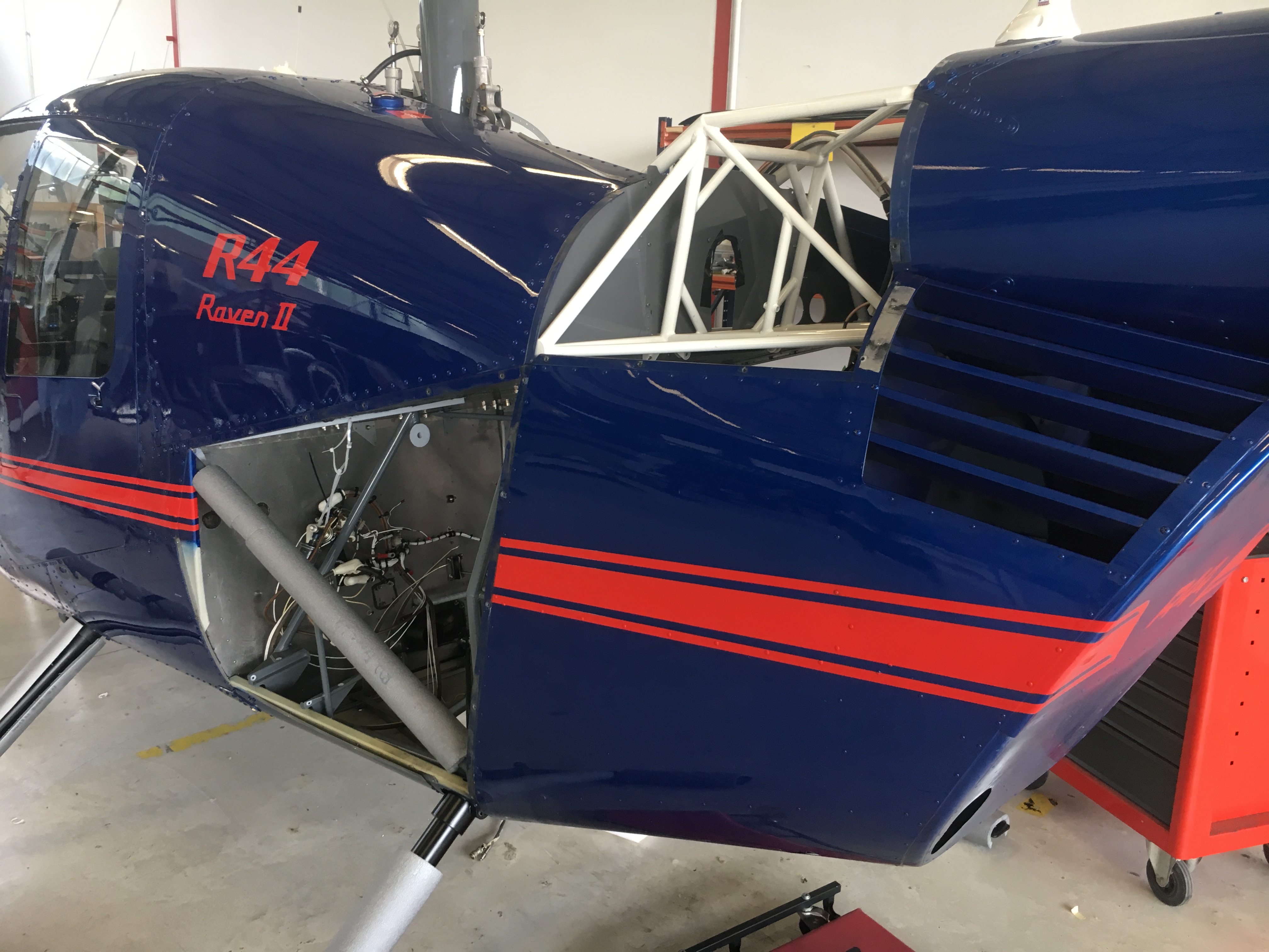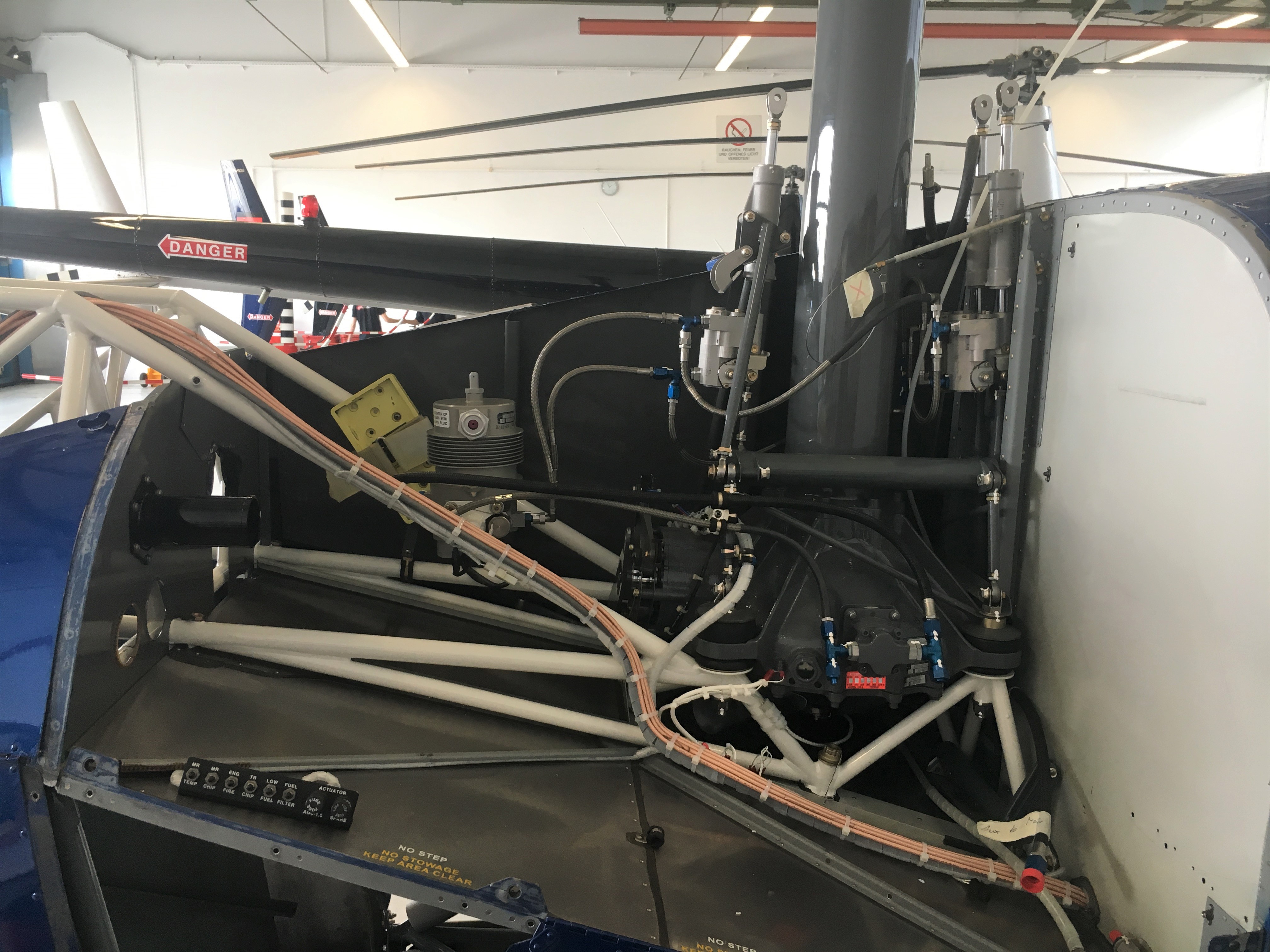 Außerdem fanden sowohl der Haupttank als auch die komplette Hydraulik der Flugsteuerung wieder ihren Platz in der Zelle. Vom Hersteller Robinson erreichten des Weiteren die neuen Seitenverkleidungen die Werft in Mannheim. Durch Vibrationen kommt es nicht selten vor, dass an den Verkleidungsblechen Risse entstehen oder Schraubenlöcher eingescheuert sind. Zwar wird dies alle 100 Stunden kontrolliert und gegebenenfalls repariert, dennoch sind diese Reparaturen erkennbar und nicht immer schön anzusehen.