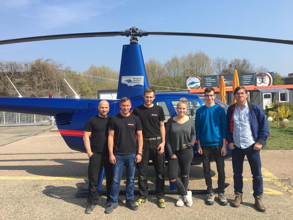 Am Montag, den 15.04.2019, war es soweit. Die D-HHGR erreicht mit einem Stundenzähler-Stand von 2200,0 die Werft in Mannheim und Kai Naujokat wird vom Werftleiter Denis Link empfangen. Es gibt noch ein gemeinsames Bild mit einem Teil des Werftteams und dem Team von HTC. Anschließend geht es für den Heli in die Halle auf seinen Parkplatz für die nächsten Monate.