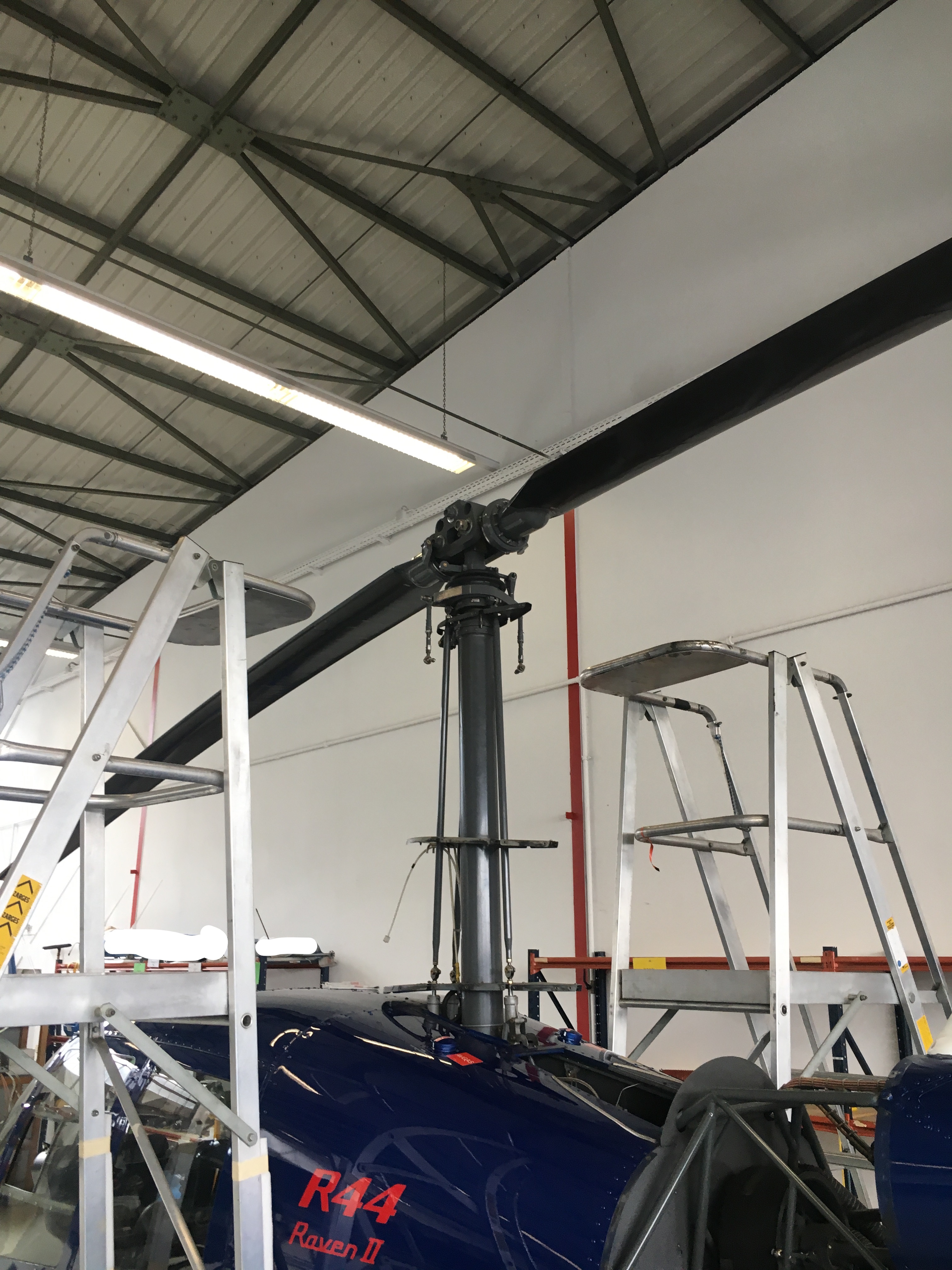 Sobald das Hauptrotorgetriebe freigelegt ist, beginnt auch hier der Ausbau. Parallel dazu demontiert ein zweiter Techniker die Einheit, die die Kraft des Motors auf den Antriebsstrang des Hubschraubers überträgt. Bei Robinson handelt es sich hierbei um eine Riemenkupplung. Dabei spannt eine elektrischer Spindeltrieb 4 Gummiriemen. So kann der Motor ohne Verbindung zu den Rotoren gestartet werden und dann langsam die Kraftübertragung aufgebaut werden.