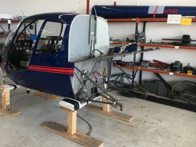 Nachdem alle Komponenten des Antriebsstranges ausgebaut sind, steht nun lediglich noch die Zelle mit den Rahmenteilen und dem Fahrwerk im Dock. Rahmen und Fahrwerk werden entlackt und rissgeprüft. Für diese Zeit steht der Hubschrauber auf einem Holzgestell.