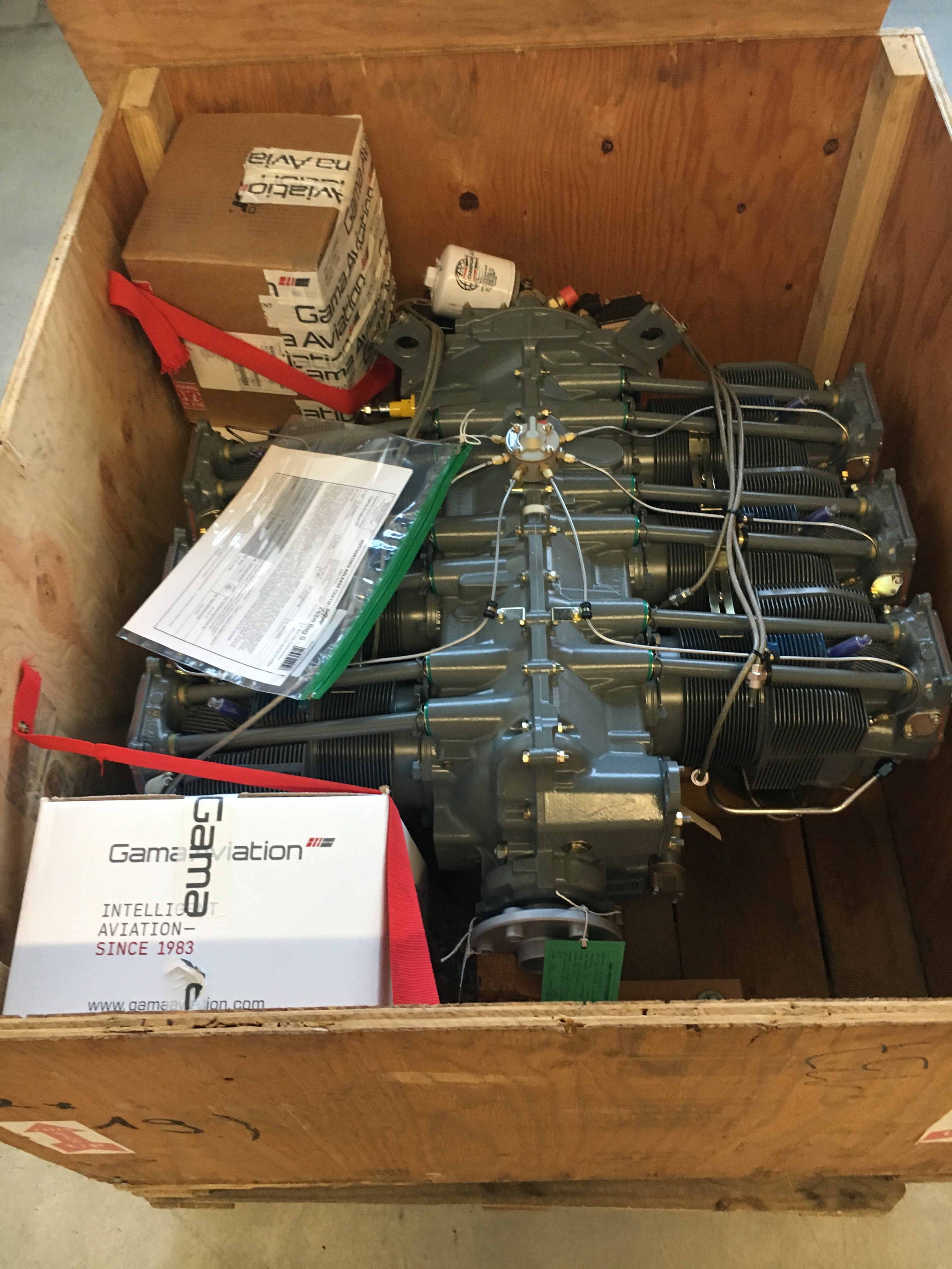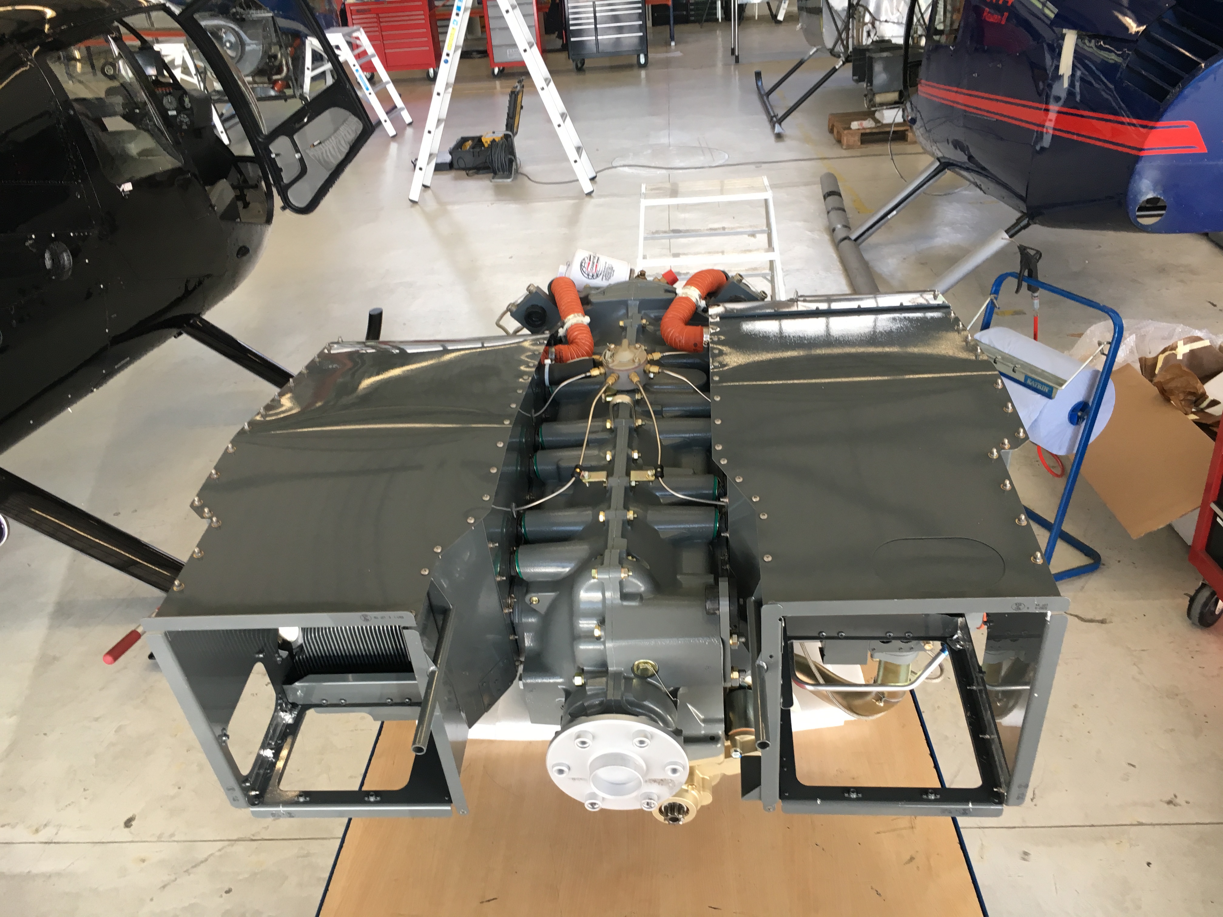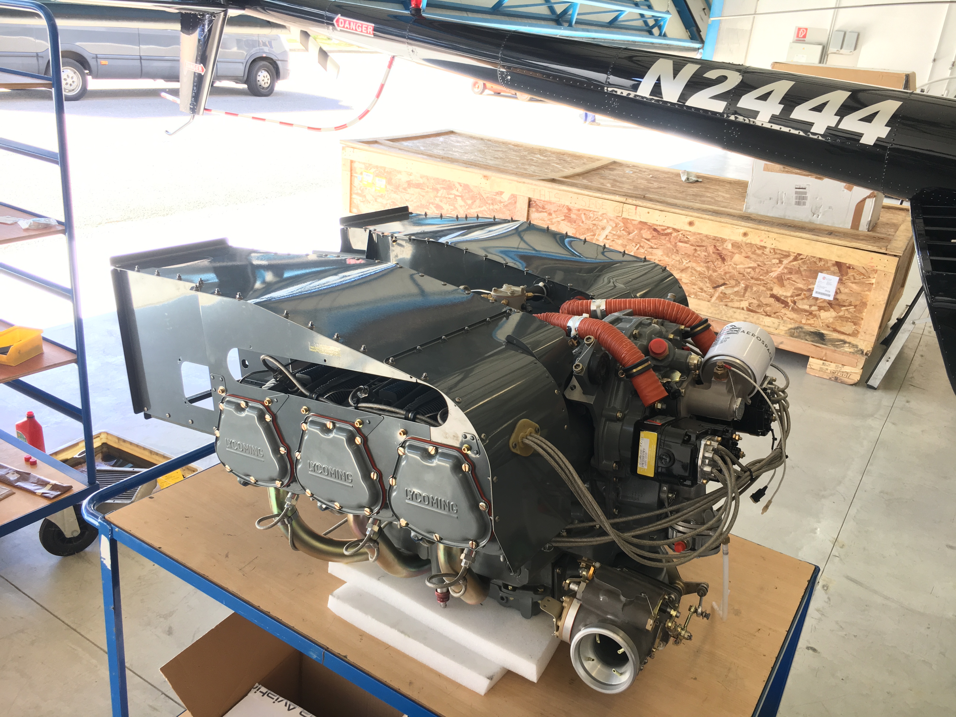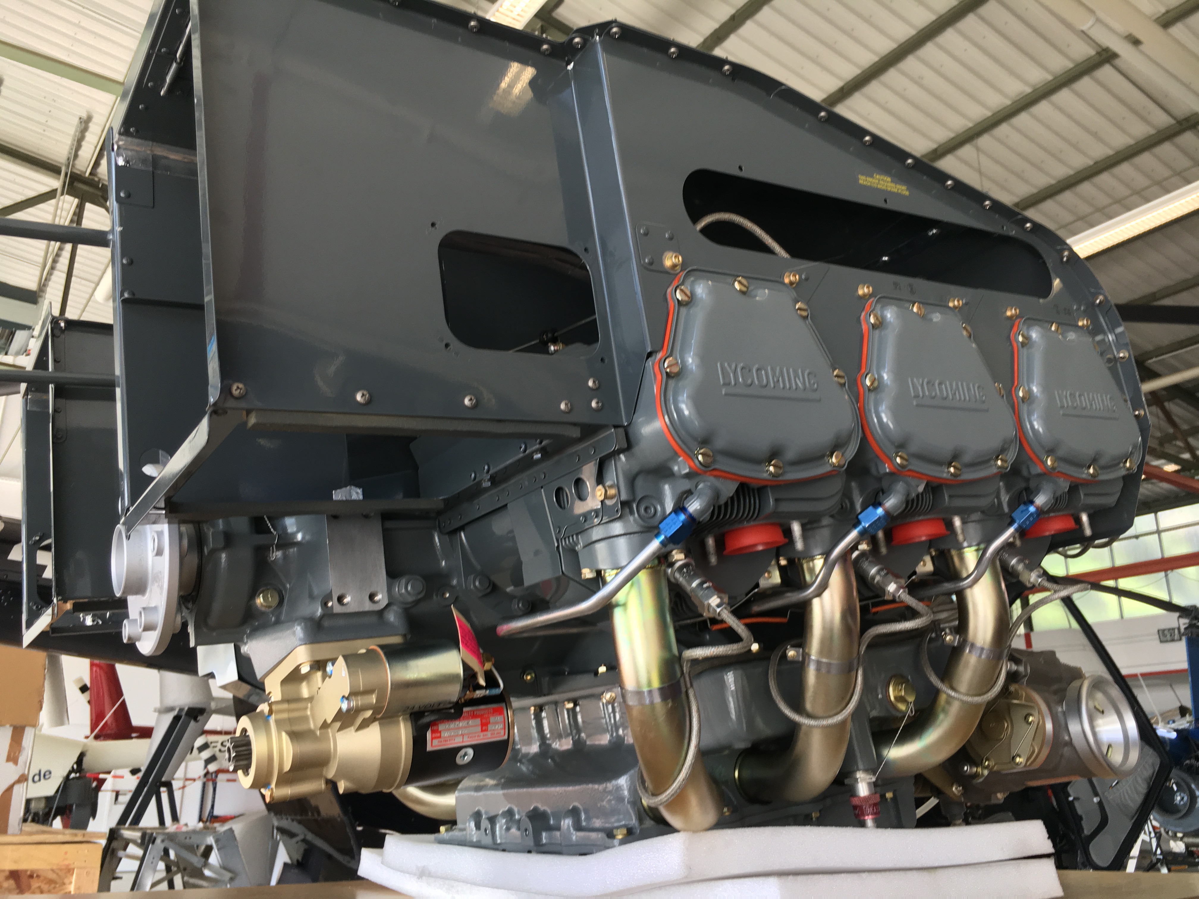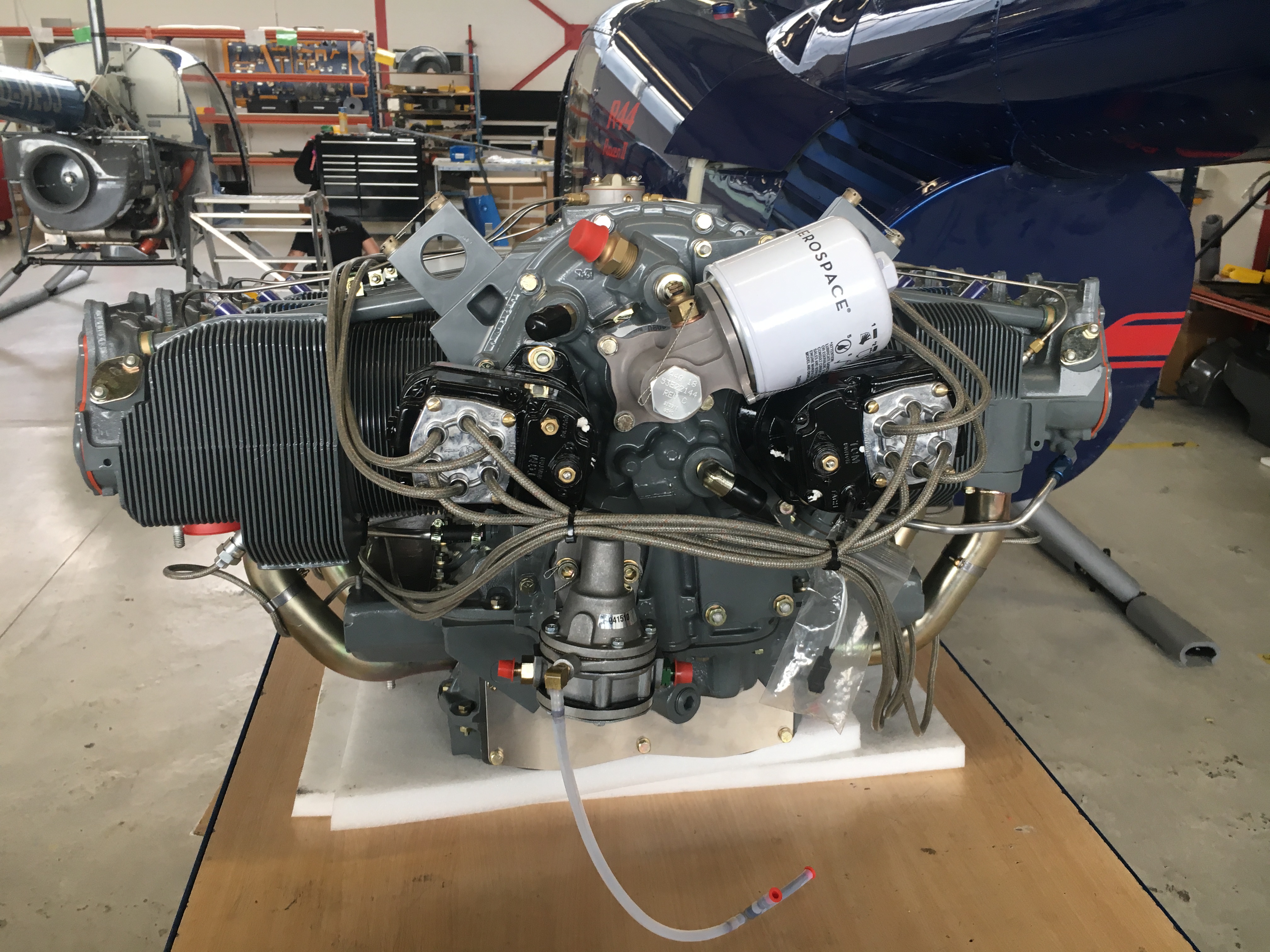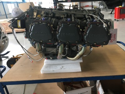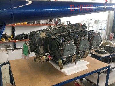 Wie bereits im letzten Bericht erwähnt, befindet sich der Motor des Hubschraubers bei einem zertifizierten Überholungsbetrieb in England. Gemäß Lycoming SI-1009BD muss der Motor alle 12 Jahre oder 2200 Stunden überholt und inspiziert werden. Bei der vorliegenden Motorvariante handelt es sich um einen Boxermotor mit sechs Zylindern. Aus der Teilenummer IO-540-AE1E5 lässt sich sowohl erkennen, dass es sich hier um einen Einspritzer mit 540 in3 Hubraum handelt, was in etwa 8,8 Litern entspricht.